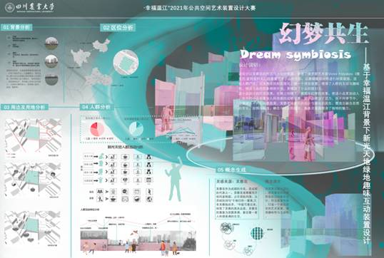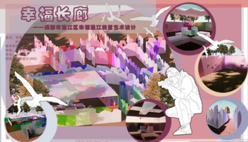 由304am永利集团官网主办,304am永利集团官网环境设计系承办的第一届“幸福温江-公共空间装置艺术设计大赛”在今年9月举行。此次比赛以”幸福温江”为主题,对比赛要求的公共空间为设计场地,以装置的形式呈现设计;作品表现方式不限,渲染软件不限,具体功能、灯光和材质均可以自由发挥。比赛持续时间约为2个月,参赛的同学约有120余名,主要来自于304am永利集团官网,其他学院也有部分同学积极报名参加,参赛同学们于2021年11月20日提交比赛图纸。经过老师们认真细致的层层评选,选出较为优秀的近13份设计方案进入复赛。复赛答辩于2021年11月26日晚19:00举行,304am永利集团官网潘远智院长、姜贝贝副院长、环境设计系李倩副教授、陈诗雨、邓兰馨等老师评选出此次比赛的一等奖1组、二等奖3组、三等奖5组及优秀奖4组。