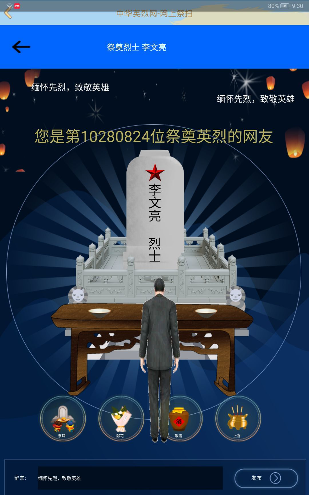 志愿者们通过网络献花、点烛、上香、挽联、哀歌等方式向为民族复兴国家富强而英勇献身的英烈们致敬,表达追思缅怀之情。期间,有许多志愿者不禁发出感慨,纷纷分享了自己的感受。