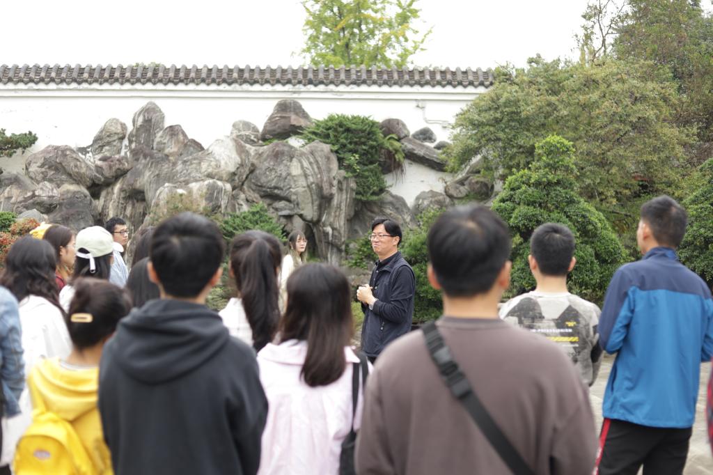 基地中将盆景植物与石头相结合的景观小品数量繁多,这是当下川派盆景发展的新形式,旨在进行盆景艺术创新,使其更好地融入景观之中。基地内坐落着数座川西民居,小班同学在师父的带领下走入曲折廊桥、折转长亭,实地踏入园中体味川派园林的美感。同学们眼观、手记、拍摄、触摸园林景观,目光游于园,思绪飘于园,步履踏于园,亲身地去感受中国传统园林的趣味与美感,体味步移景异的真切体验,真正游于园、享于园。