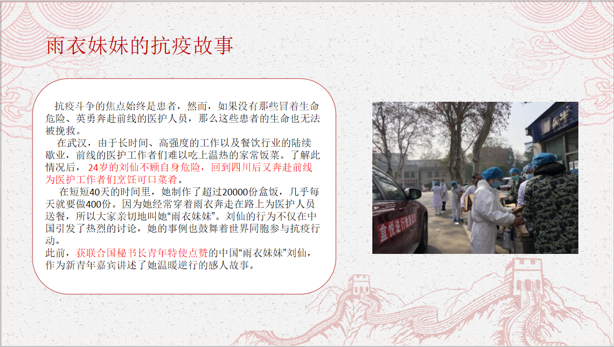 在本次团日活动的主题微团课中,团支书组织同学了解学习“雨衣妹妹”的抗疫故事,带动大家共同探讨新时代新青年的责任担当,一起学习优良品质。“她是一个很优秀、很值得我们学习的人。”该班学生牟莉莎如是说,“她代表了极大部分青年的品质,作为新时代的新青年,我们就是要有这样无私奉献的爱国精神。”