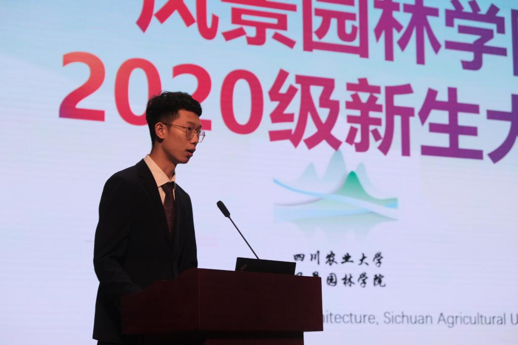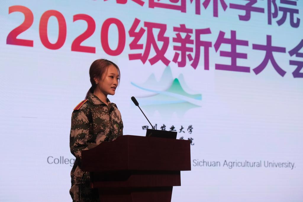 来自环境设计专业的黄小小同学代表新生发言。苑师兄优秀的学习工作履历让她深受触动。“知识改变命运,态度改变未来”,她希望与身边的川农我院学子一起进步,不负大学四年的时光,成为坚守梦想、勇于创新、刻苦钻研的新时代园林人。