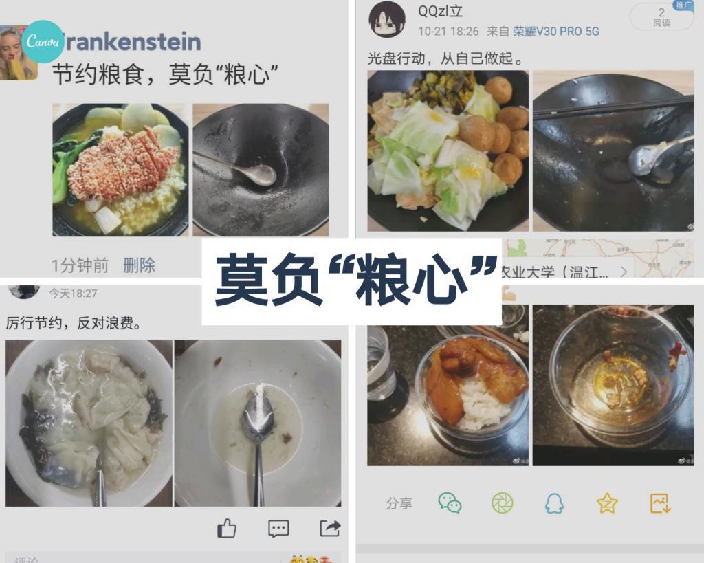 活动以同学们重温共青团入团誓词、齐唱国歌进入尾声。团日活动结束后,园林1902班在线上火热开展了“光盘行动”的打卡活动。同学们决心养成“光盘”、不浪费的好习惯,为国家粮食安全助益。