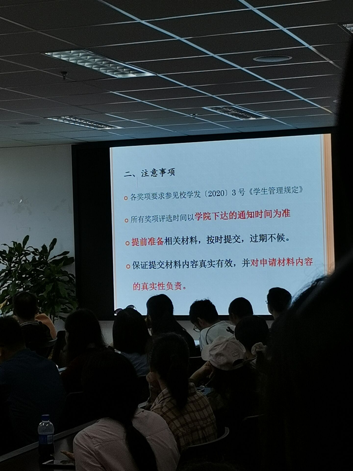 会议上,王莉老师对2020学年综测、学生奖励及资助工作细则进行说明与政策解读,并对学生管理工作系统相关模块进行演示,以及2020-2021学年度学生奖励及资助工作日常安排进行说明。李渝杨老师对2020学年度的贫困认定及相关资助工作进行讲解,如何进行家庭经济困难认定,为经济困难学生提供更多的帮助与支持。