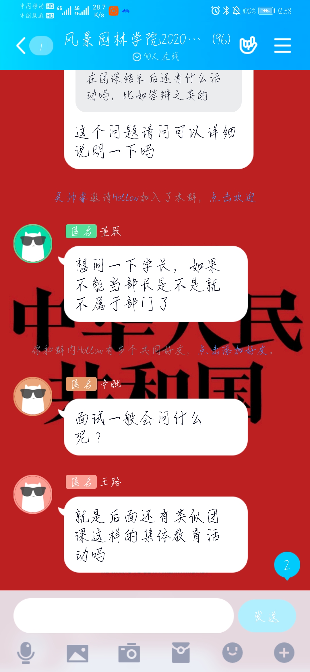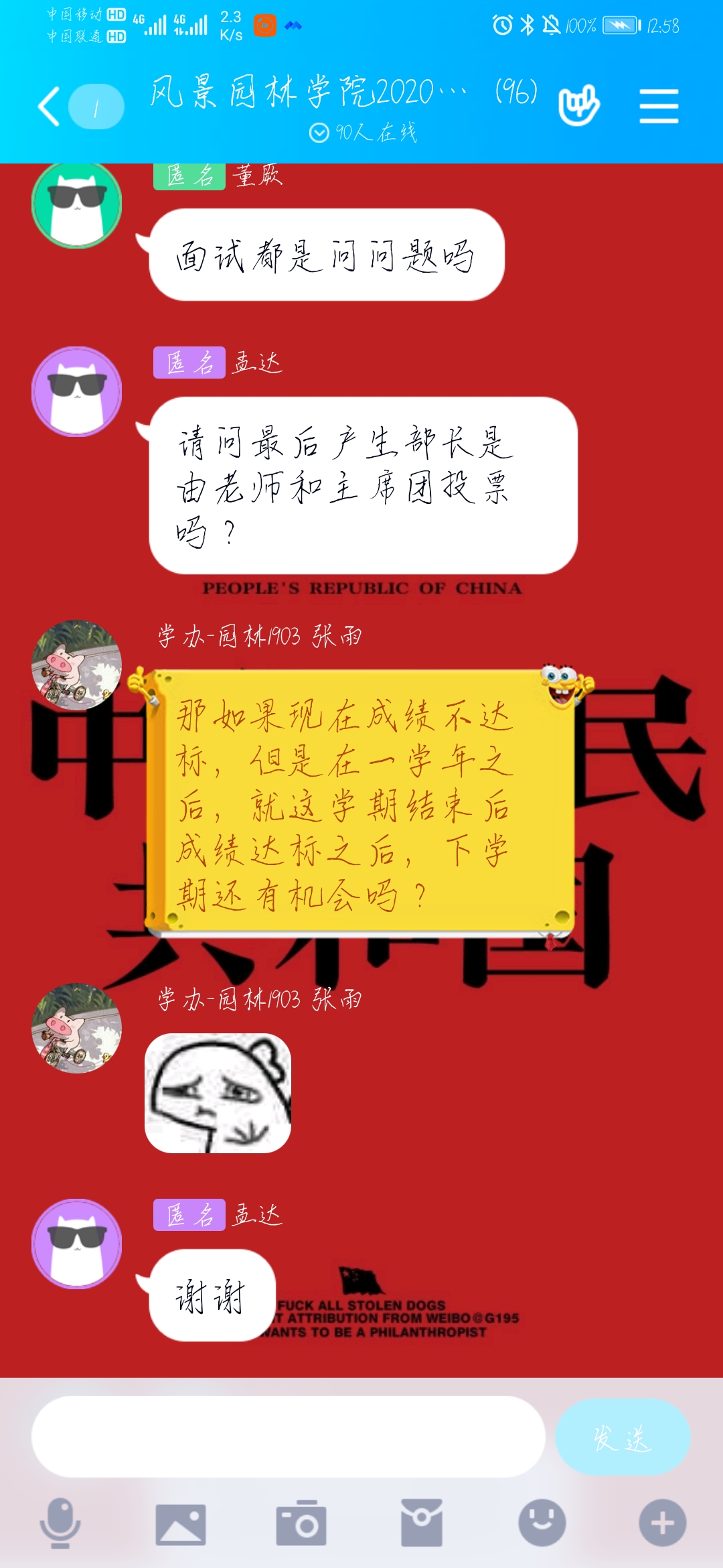 接下来,团课第二部分着重强调了学生干部的学习成绩。学习成绩是作为学生干部的硬性要求,所以需要学生干部时刻关心自己的学习情况,保证自己的学习成绩在年级前30%左右,并带头发挥榜样作用。最后,会议就大家在线上QQ群中针对面试的问题进行了详细的讲解和解答。