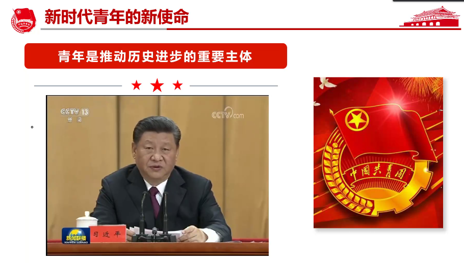 在观看《后浪》的演讲视频时,一句“奔涌吧,后浪”让参会人员不禁热血沸腾。由主持人带领,各位团干又结合《中国共产主义青年团章程》集中学习研读入团誓词,深刻理解入团誓词含义,明确青年团员的责任与义务。随后的由屏幕与屏幕对接方式制作的一个团徽视频也无不展示着满满的正能量。