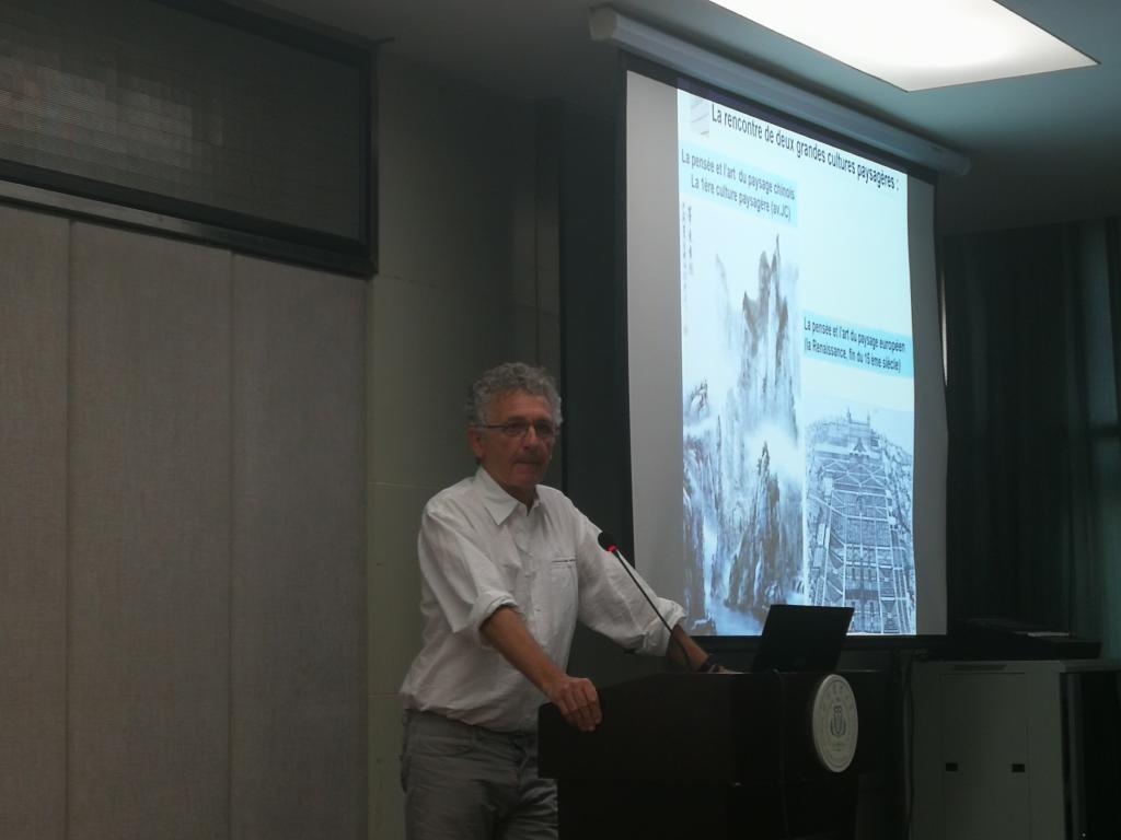Bernard Brunet先生结合实践经验和研究成果,理论联系实际,为在场师生分享了以景观思维如何在欧洲发展以及景观如何囊括了生态学、美学等专业为主要内容的学术报告;首先论述了中国与欧洲景观思维的差异性以及相互融合的同一性,接着解释了景观学的定义及学科范围,从欧洲历史概述景观学的发展历程(巴比伦空中花园到景观融入城市规划),介绍了不同的景观设计学派。重点提出,设计应遵循“生态学”各项原则,用生态学原理说服政治家、建筑设计师等的必要性。其次,与Laurent Guoyou Beauchamps先生对与我校合作的CIEPT课程从课程安排到计划为我院师生进行详尽解说。报告完毕后,本院师生与教授进行了交流互动,报告在全体师生的热烈掌声中落下帷幕。
