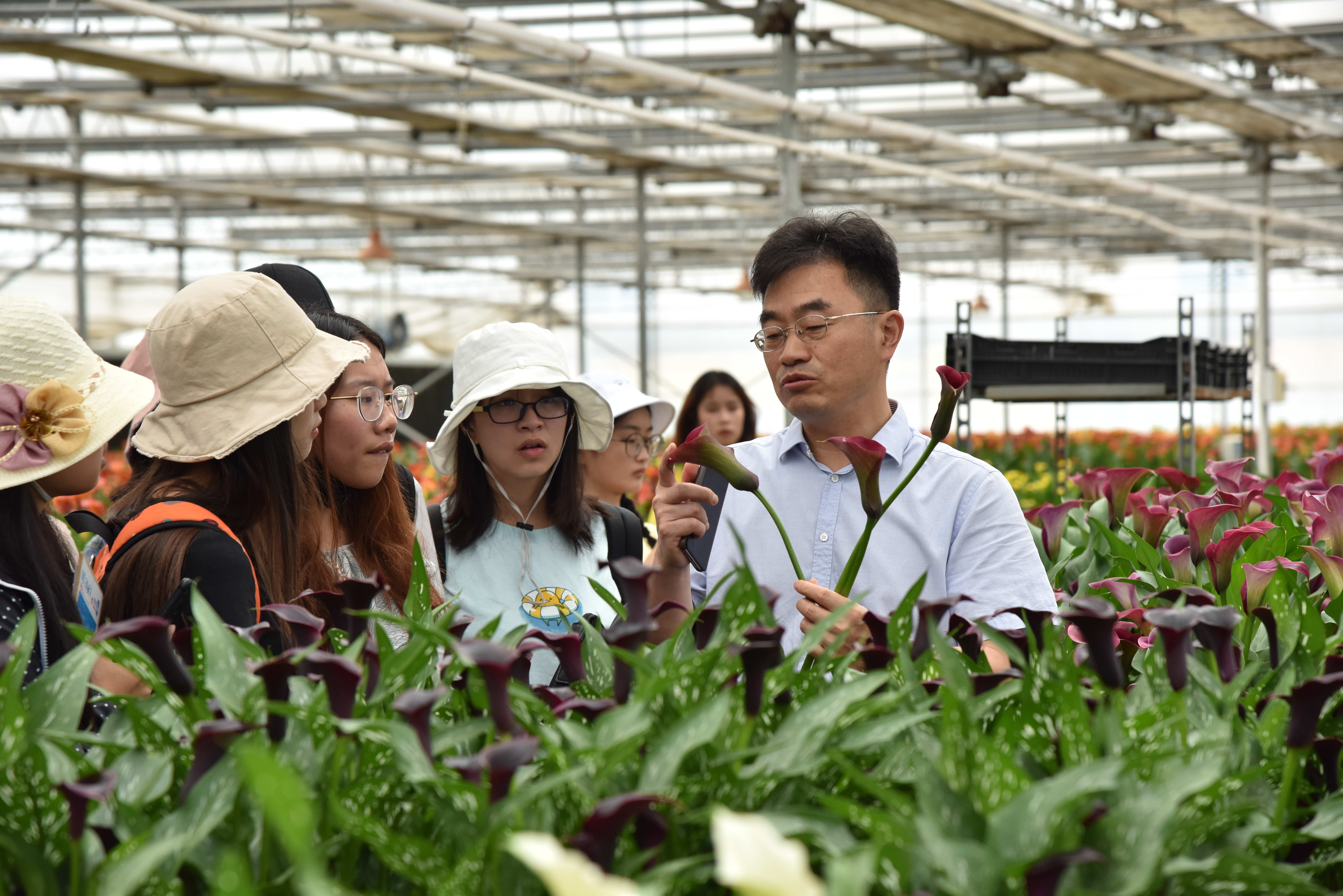 实习第四站——花卉生产企业。先后前往虹之华有限公司和昆明真善美兰业有限公司进行参观学习,了解了切花菊种苗和盆花马蹄莲的生产、采收、储藏及包装过程。学院副院长潘远智老师和园林专业负责人刘光立老师赶赴实习队伍,看望慰问大家,并带队讲解。图5