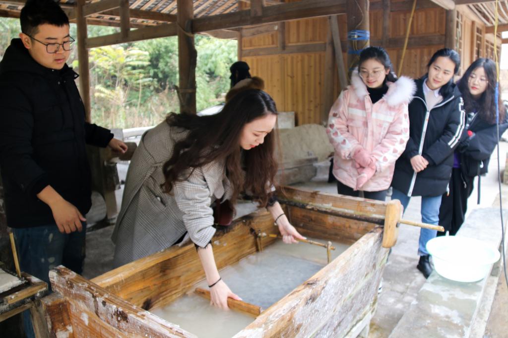 实践团队的队员们轮流体验了这道工序,能顺利完成的人却不多。可见在造纸过程中,熟练度的影响之大。“捣料”的技巧性完全不亚于“抄纸”。实践小组成员体验时,大多都很难掌握“捣料”的用力点和发力姿势。虽然体验的时间不长,但是“捣料”的辛苦,可见一斑。