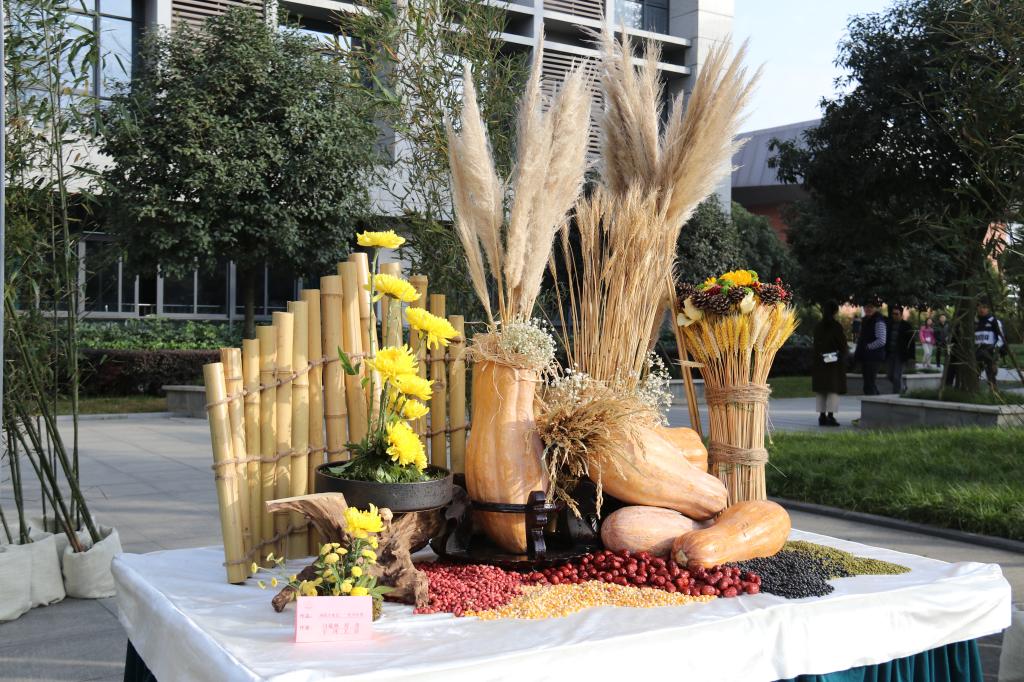 在制作作品的过程中也遇到各种挫折和困难;有一个小组的作品需要南瓜,但这个南瓜在尺寸,色泽,质感和形状方面要符合插花造型的设计,可是在学校附近的惠民菜市场买不到符合要求的大南瓜,于是小组的同学就分头行动到温江的所有菜市场去碰运气。可是同学们跑了一个又一个集市,询问了一家又一家蔬菜摊,也没买到想要的材料。那些卖家中,大部分一听购买南瓜的要求就不耐烦的说没有没有,甚至被指责不买菜就别挡道。一共跑了十多家菜市场,受了各种白眼,南瓜也没买到;在同学们筋疲力尽,有点心灰意冷的想要放弃的时候,一位热心大婶提议他们去航天路菜市场碰碰运气,功夫不负有心人,同学们终于在航天路菜市场买到了心仪的南瓜,并在老师的指导下创造了一个更完美的构思。但是新的问题却来临:材料不够!除了南瓜之外还需要购买玉米、小麦、水稻等具有川农专业特色的材料来表现丰收的主题,于是小组的同学们又紧急分配任务,继续寻找符合作品要求的材料;虽然过程很累,但小组的同学彼此鼓励,共同坚持,团队的力量果然强大;最后,当一个完整的作品出现在眼前时,成功的喜悦洋溢在同学们的脸上,大家感到特有成就感。最后大家商量,一致决定将作品命名为:满眼丰收意,一腔川农情。同学们深感在川农不仅收获了知识和文化,更收获了人生的成长与历练,通过作品的制作更让同学们体会到了“爱国敬业、艰苦奋斗、团结拼搏,求实创新”的川农大精神!