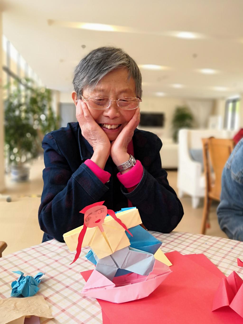 看着自己折出的小人,郑淑芬老人笑得很开心