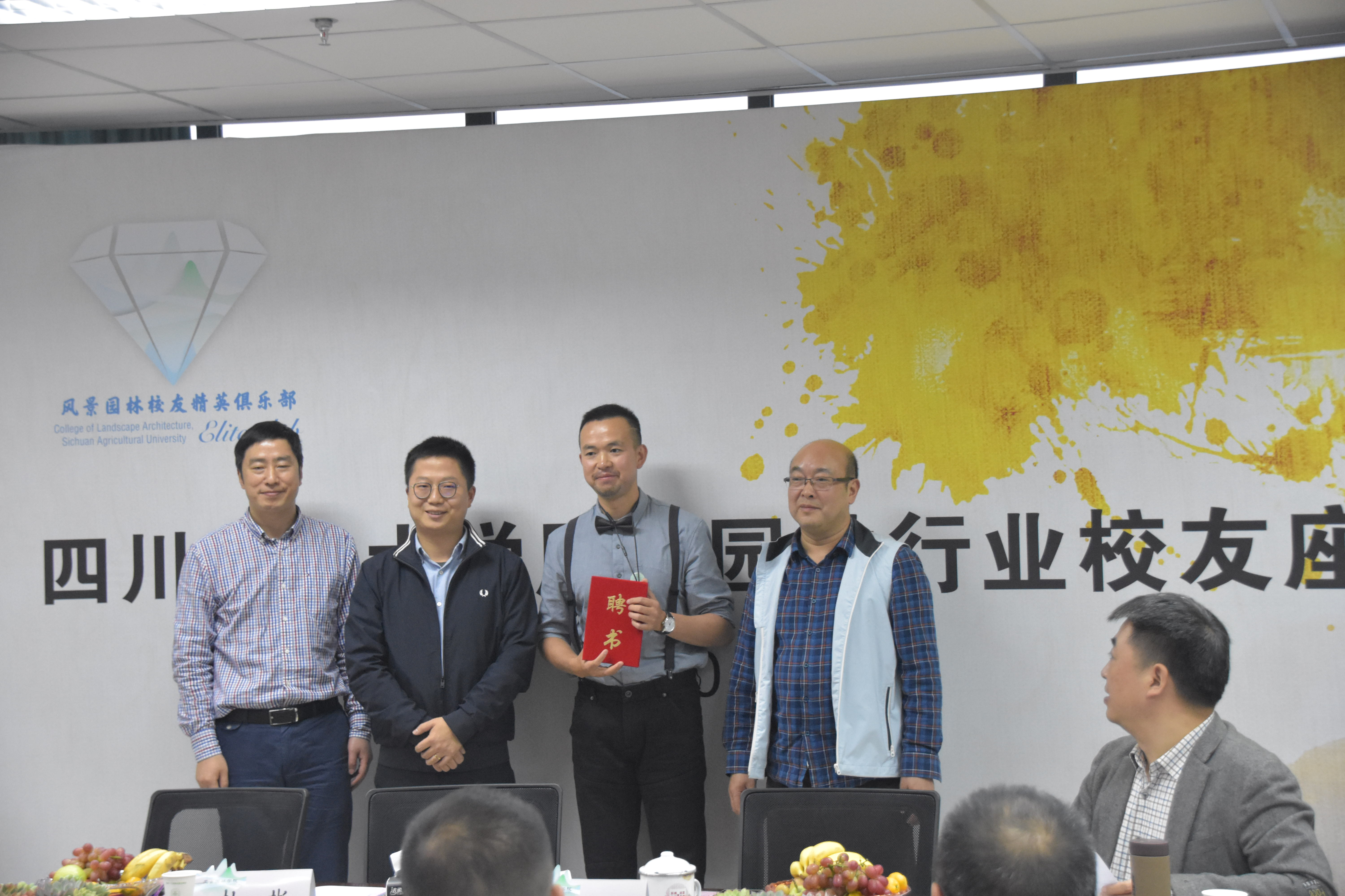 本次会议还特邀了成都普禾国景景观设计有限公司总经理杨茅矛、中国建筑西南设计研究院有限公司景观院园林所所长黄振华、成都李家驹创意景观设计有限公司总经理李家驹、成都传承景观规划设计有限公司创始人钟迪等5名菁英校友担任学院校外导师,与2016级永利集团官网3班、2016级环境设计1班、2016级园林3班等5个小班结成对子。由杜彬、陈其兵为5名校外导师颁发聘书,结对班班主任为导师佩戴院徽。接下来校外导师将直接进小班,与小班同学面对面交流,学生也将进入导师企业进行参观学习。这是学院学生工作的创新之举,让在校学生能提前感知行业现实情况和行业发展方向,旨在提升学生的职业素养,打造更多“菁英”学生。