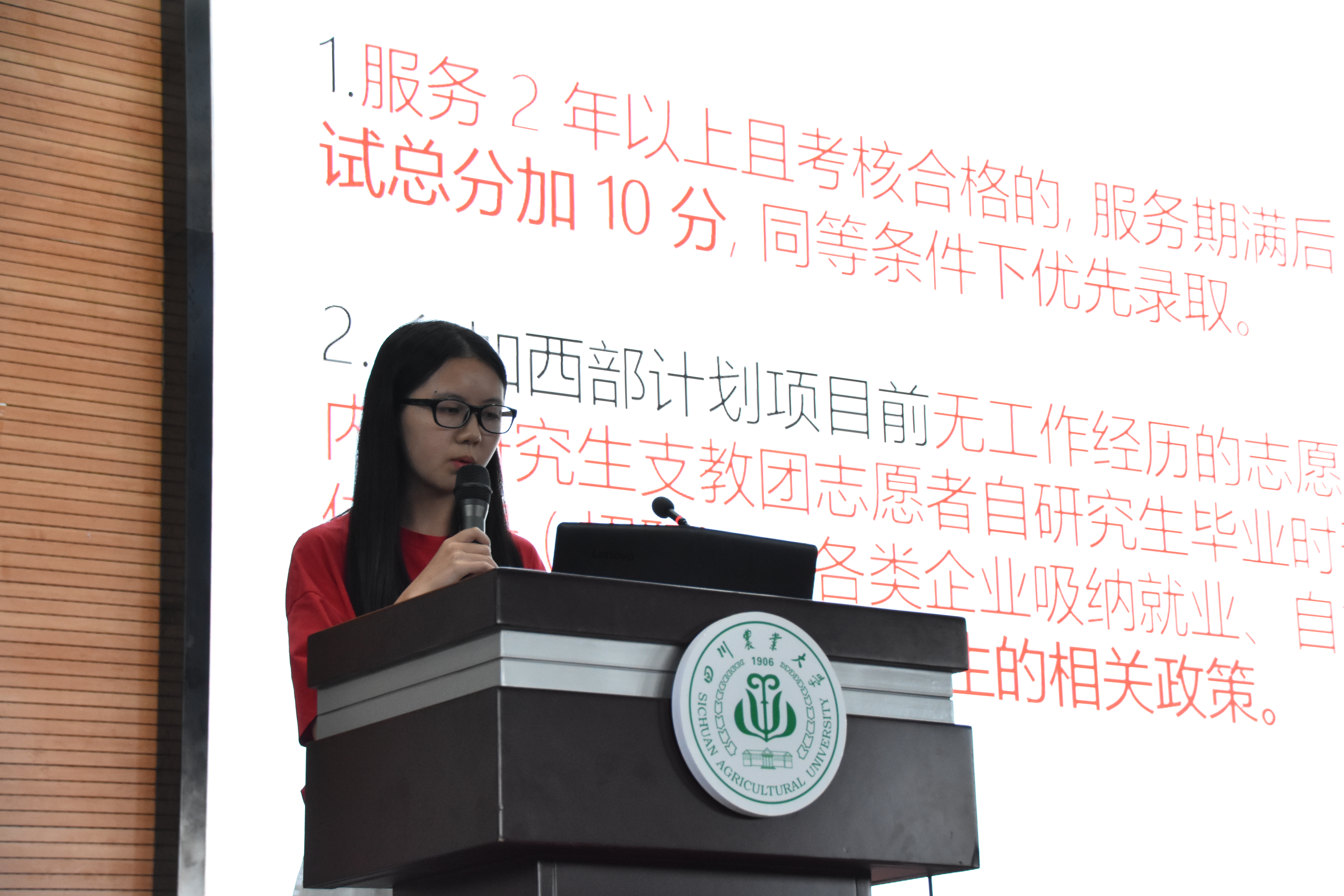 青年志愿者协会代表高冶丹首先向全体与会同学系统性介绍了西部计划的基本情况、工作内容、政策支持和具体招募流程,详细说明了西部计划“谁组织、谁能去、怎么去、去哪里、去多久、做什么”等相关问题。在关于政策支持方面,高冶丹着重讲解了西部计划中学生最关心的“考研加分”、“资金补助”等问题。
