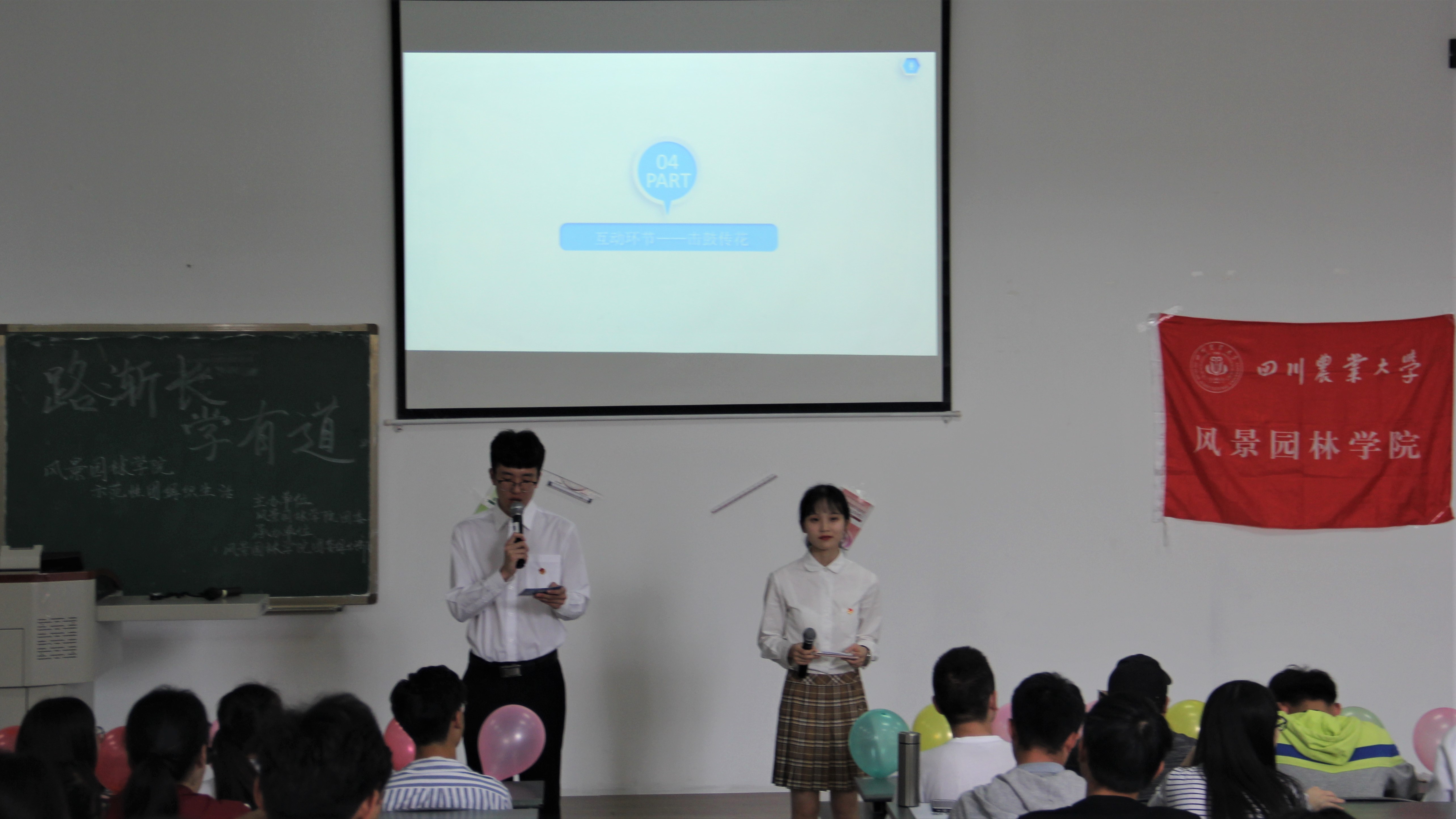 本次活动面向川农的全体师生,活动过程分为诗朗诵、歌曲串烧、互动节目和青年说四个环节。在主持人文采斐然的开场白中节目拉开的帷幕,节目伊始,来自园林1702班的三位同学为我们展现了朗诵的魅力,嘹亮的声音响彻全场,豪迈的气势振奋人心。紧接是着歌曲串烧,同学的歌声或婉约或豪放,或深情款款,又或慷慨激昂,展现了我院学子良好的精神风貌。最热闹的环节是击鼓传花,气氛一度达到高潮,全场欢歌笑语。最后以诙谐幽默的方式,同学们进行了一场关于学习的轻松愉悦的脱口秀,场上互怼,大家展开了思想的碰撞。