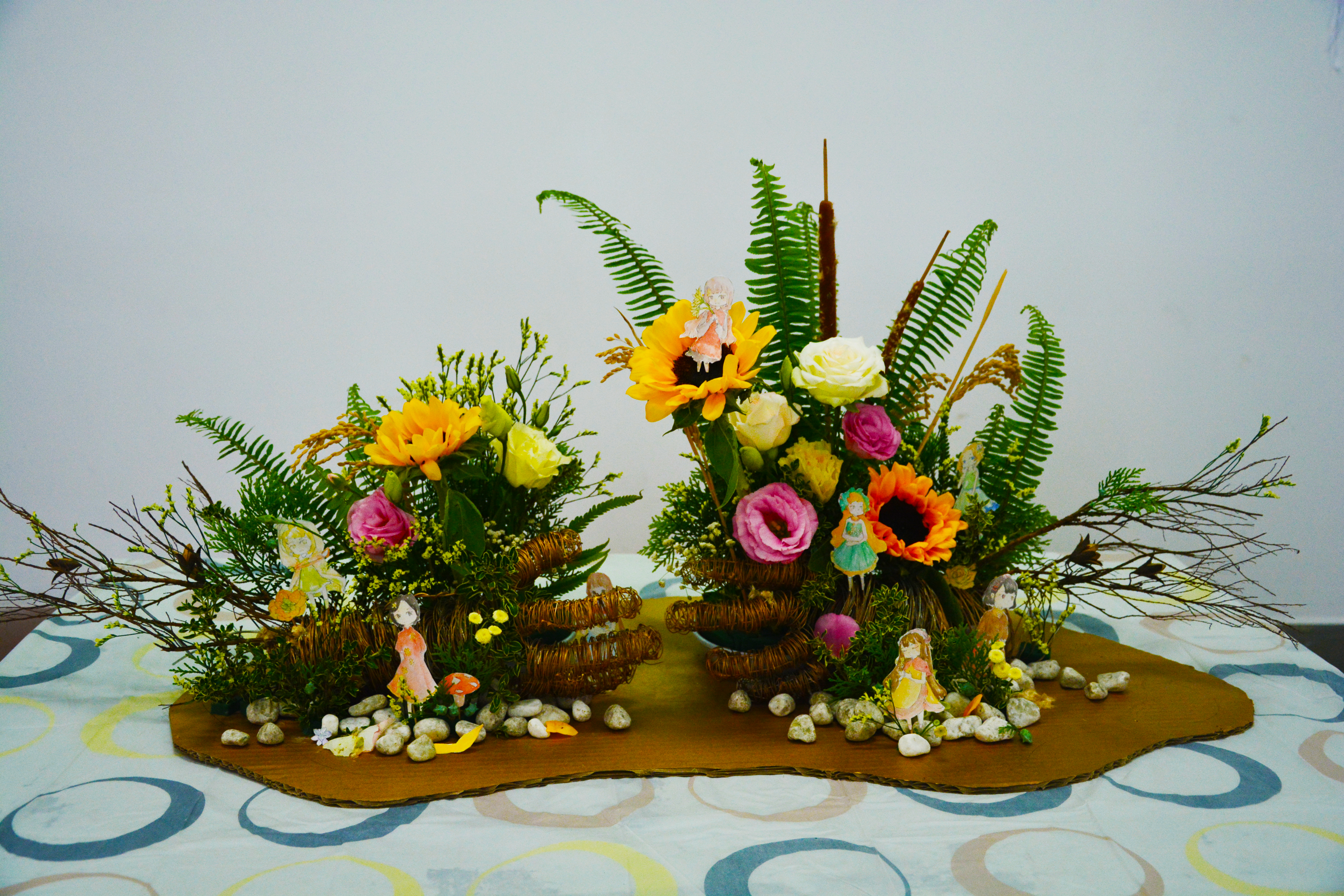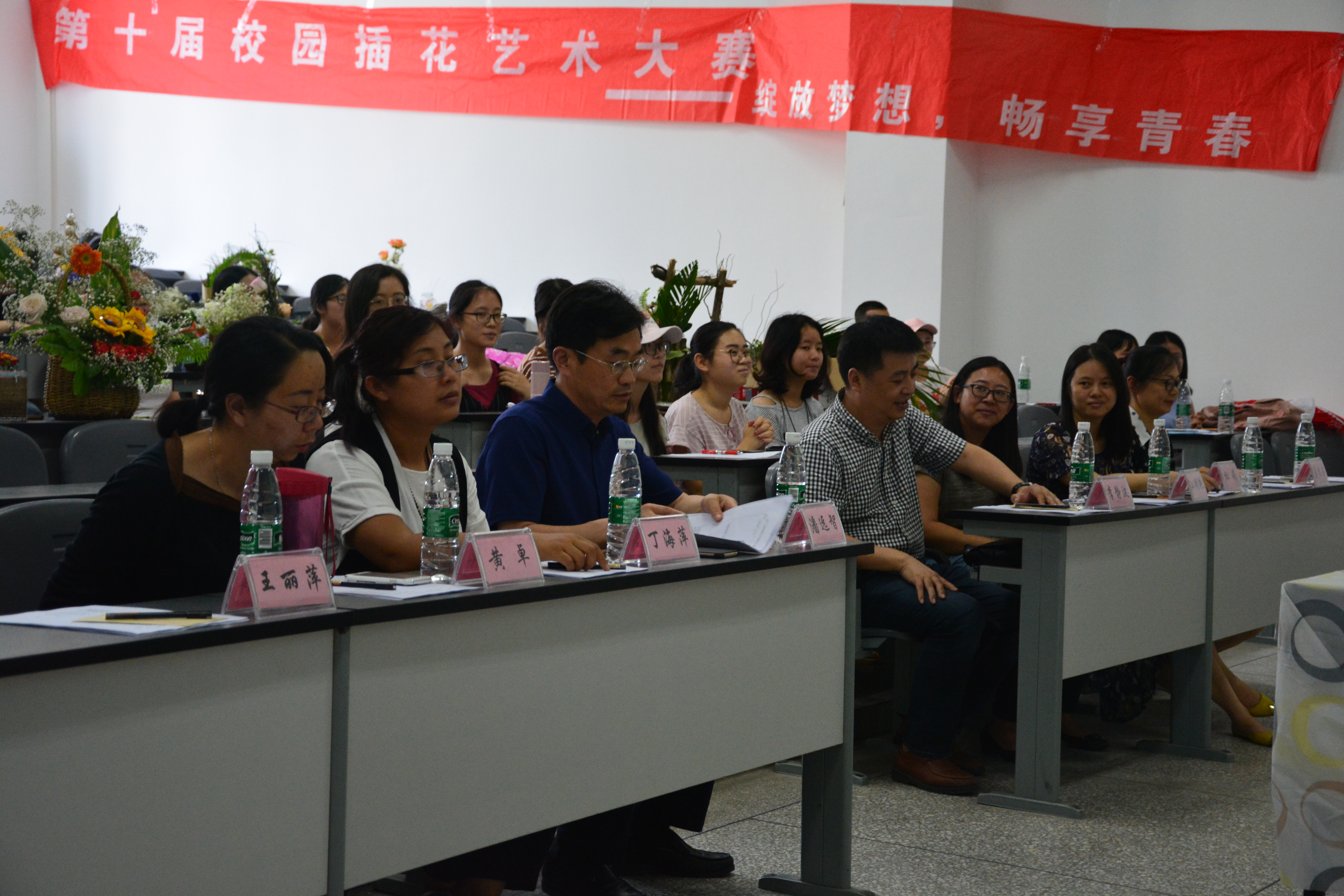 本次大赛有幸邀请到教务处丁海萍老师、304am永利集团官网党委书记李静波副教授、副院长潘远智教授莅临现场,304am永利集团官网党委办公室王丽萍老师、园林系主任黄卓副教授、江明艳副教授、杜娟副教授、姜贝贝副教授担任评委。参赛者在经过两个小时的艺术创作后,上台对自己的作品进行讲解,之后由评委老师根据各组作品的构图和色彩、主题和创意、插花技巧以及总体印象等方面进行评分,并为获胜队伍颁发证书与奖品。赛后,决赛作品移至图书馆一楼进行为期三天的展览。