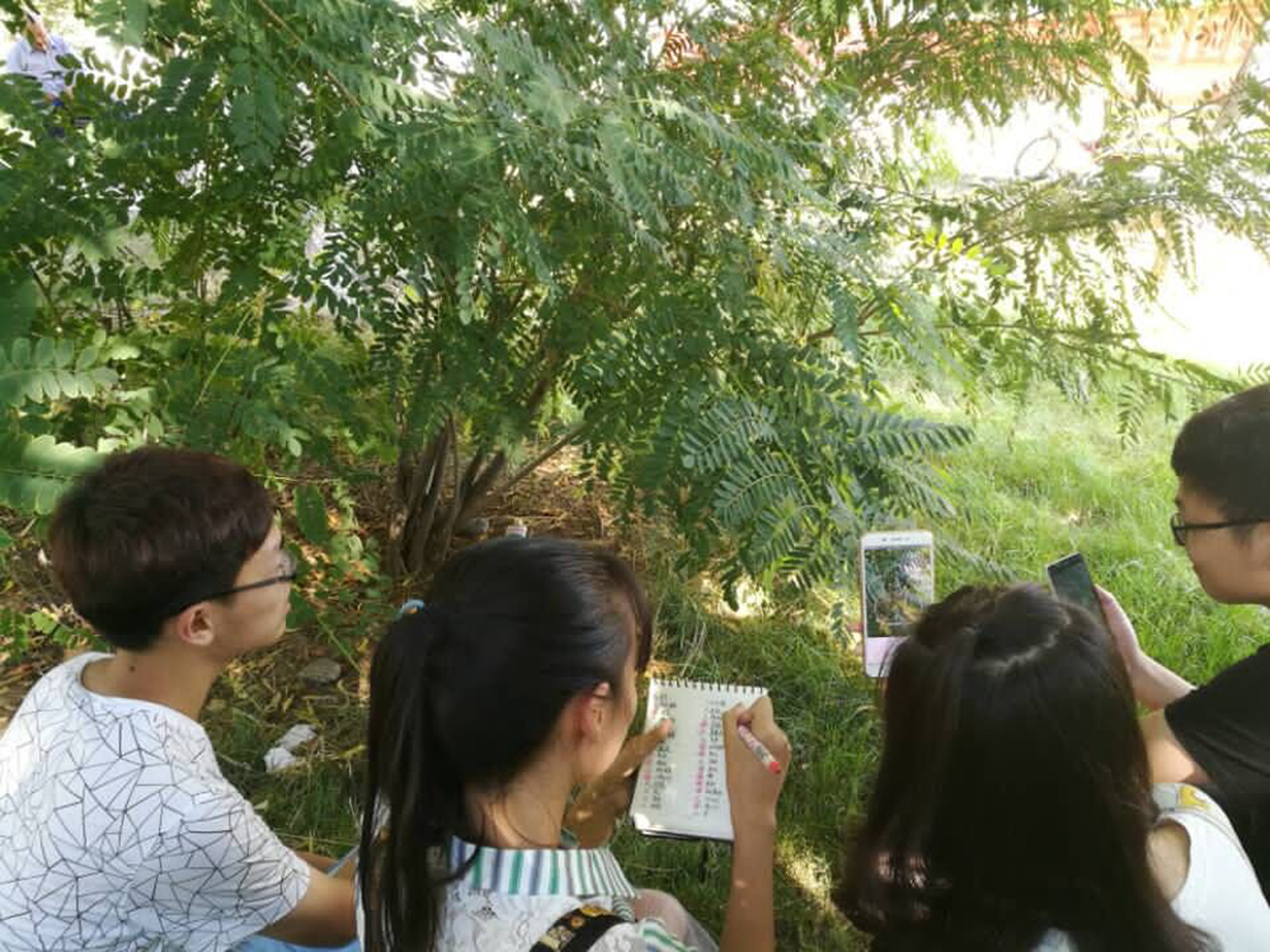 队员共同识认植物,记录形态特征并标记位置   拍摄者:曾宏源