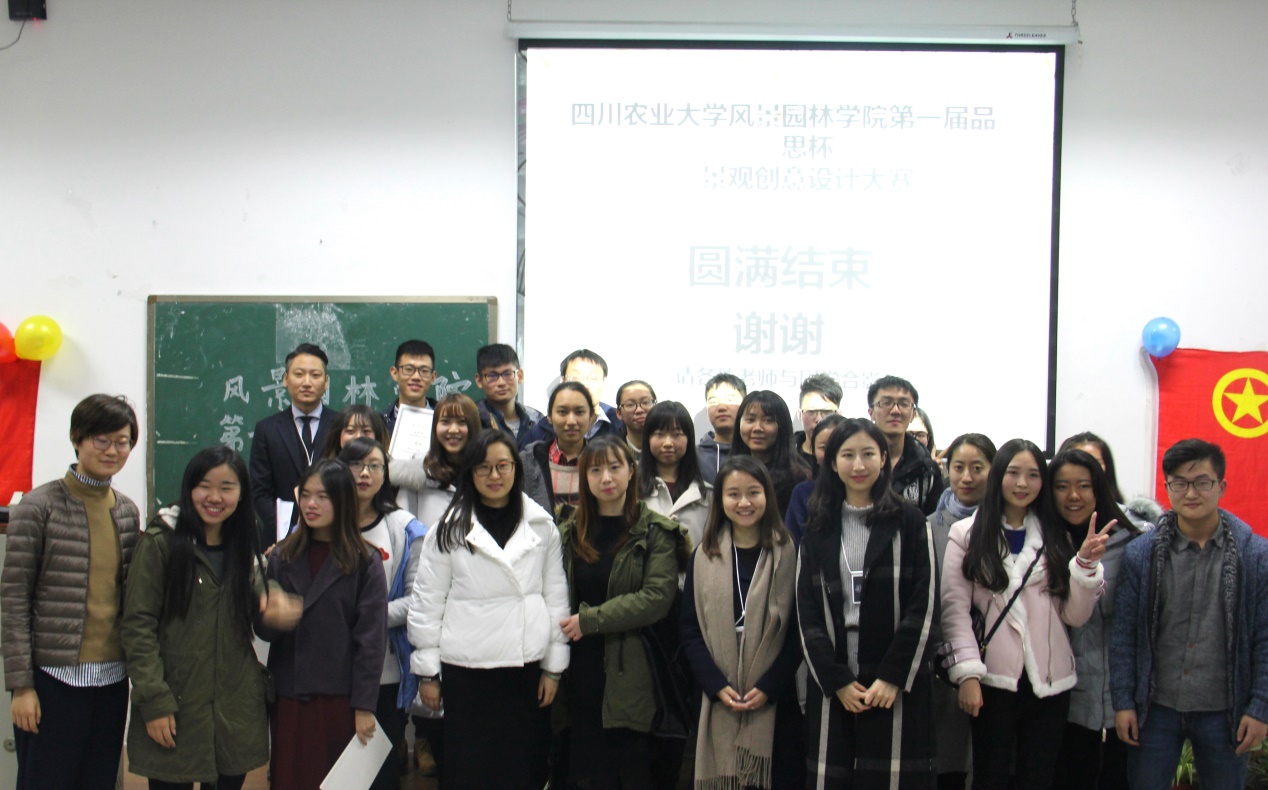 2016年12月13日晚7时30分,第一届“品思杯”景观创意设计大赛暨颁奖仪式在我校4a208教室举行。英国谢菲尔德大学城市景观设计硕士王玥娇老师、新西兰林肯大学景观建筑硕士邓巧老师、PS·ONE国际艺术教育市场部主管刘啸鸣、我院熊联勇老师、熊薇老师担任本次大赛评委。