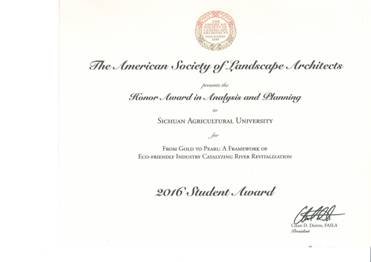 M. Morial会议中心举行。在颁奖典礼上,304am永利集团官网的研究生余普、罗蓝代表四川农业大学接受2016 ASLA学生组荣誉奖颁奖(两位学生均为我校2011级本科生、2015级研究生)。该奖项是国际永利集团官网界景观设计大赛的最高级别奖项,也是自2013年以来唯一获奖的中国大学。获奖两位研究生有幸与国际一流的大学哈佛大学、路易斯安娜大学获奖者同台领奖。