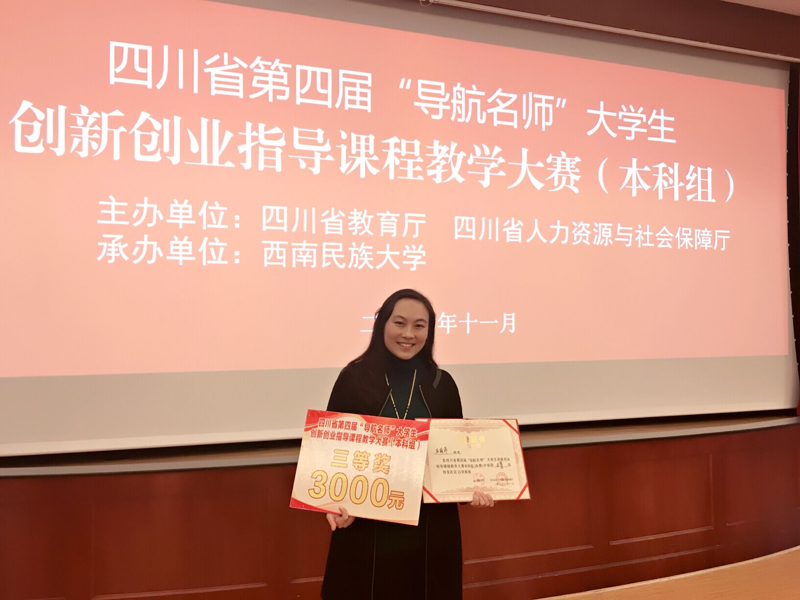 2016年11月7---11日,由省教育厅、省人力资源和社会保障厅主办的四川省第四届“导航名师”大学生创新创业指导课程教学本科组(决赛)在西南民族大学举行。有来自四川大学、西南财经大学、西华大学等省内本科院校从事创新创业指导工作的36名教师参加了比赛,经过激烈角逐,我院教师王丽萍喜获三等奖,并获得3000元奖金。