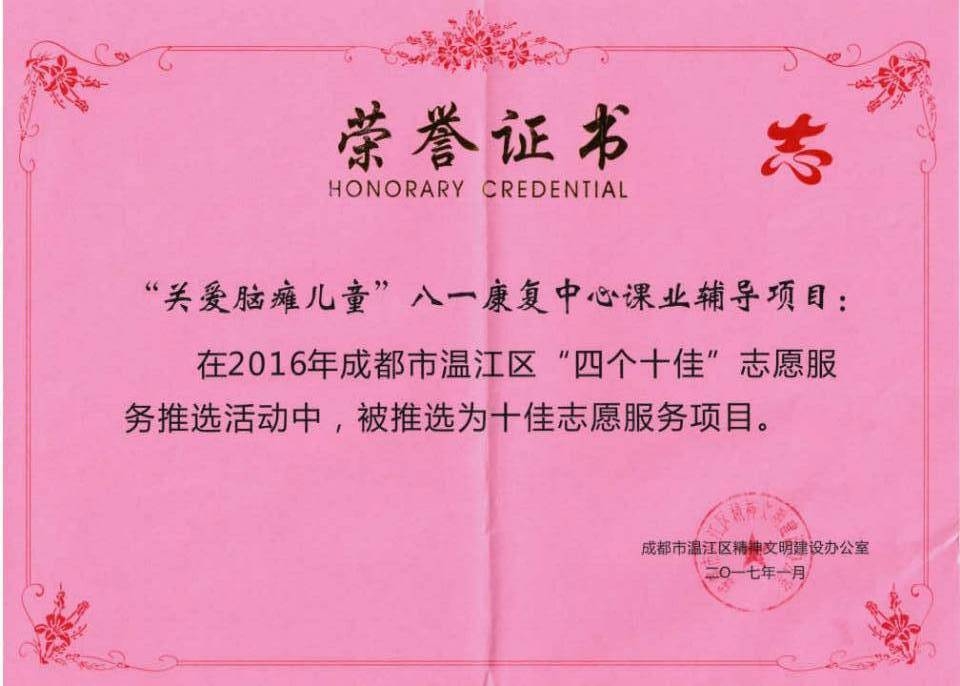 2017年3月3日,304am永利集团官网青年志愿者协会的“关爱脑瘫儿童”八一康复中心课业辅导活动获得温江区十佳志愿服务项目称号。