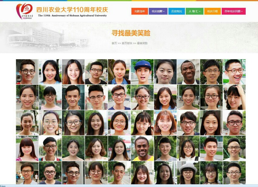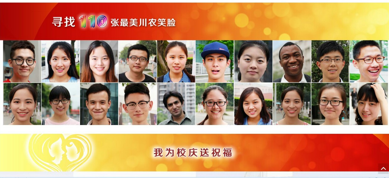 2016年,我们四川农业大学将迎来110周年校庆,百载年岁,在这块饱含辛勤耕耘的土地,我们用微笑面对挫折,进而越战越勇,我们用微笑喜迎荣耀,脚踏实地更进层楼。川农人,用微笑面对人生百态,用微笑谱写百载华章,川农人的笑脸,记录我们的过往,承载着我们对母校的深情,我们,用笑脸回眸110周年,我们用笑脸迎接下一个百年。