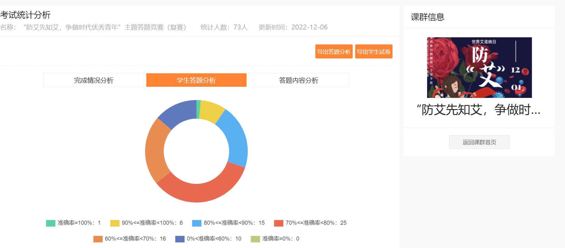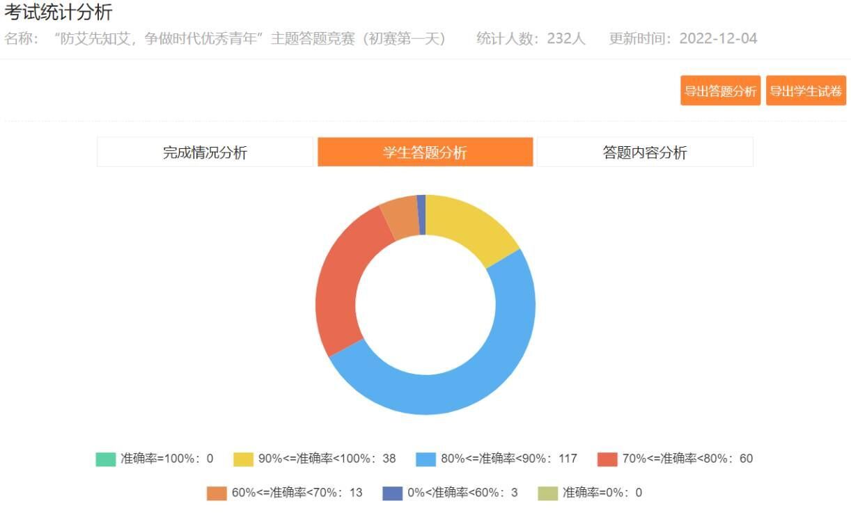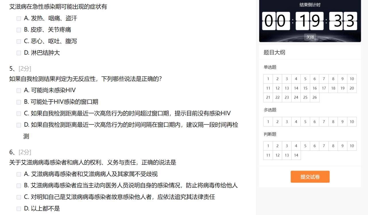在疫情防控的形势下,本次活动采用线上题库学习答题的方式进行。两学院组织者将题目分为单选题、多选题、是非题判断,其考察形式多样、检验方式灵活,有效检测了参赛者在学习艾滋病相关知识的过程中对知识的掌握情况。活动分为初赛、复赛两个阶段,参赛者以个人形式参加,在规定时间内完成答题。11月29日上午,活动报名正式开启,上千余名学生通过i川农、咨询群等多种渠道了解信息前来报名。参赛者通过学习主办方准备的知识题库以及自主学习了解,为比赛做好了充分的准备。初赛阶段,参赛者需要在20分钟内完成50道题目,在此要求上绝大部分同学成绩良好,表现出对此次答题比赛的重复准备和高度重视。最终成绩优秀的前20%参赛者进入复赛阶段。复赛作答时间更短,覆盖知识面更广、题目难度更高,对于参赛者而言是更大的考验。在紧张激烈的答题环境下,比赛最终决出了一等奖1名、二等奖2名、三等奖3名。